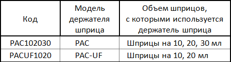 – это держатель шприца для цитологической аспирации, который позволяет выполнять цитологическую пробу и извлекать биоптат одной рукой, легко создавая вакуум в шприце. Держатель шприца модели РАС (код PAC102030) изготовлен из пластмассы и легких металлических сплавов и предназначен для использования со шприцами объемом 10 мл, 20 мл и 30 мл. Держатель шприца модели РАС-UF (код PACUF1020) полностью изготовлен из стали и легких металлических сплавов со специальной поверхностной обработкой для повышения сопротивляемости даже наиболее коррозийным дезинфицирующим растворам и предназначен для использования со шприцами объемом 10 мл и 20 мл.